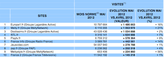 Médiamétrie vient de publier son étude sur la fréquentation des sites Internet en mai 2012. Les chiffres sont ce mois-ci assortis d’un focus sur les plus fortes progressions du mois ainsi que les résultats du classement CybereStat de 14 groupes et 56 sites.